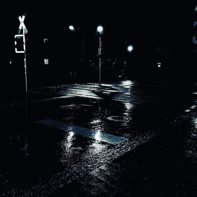 Dreiköpfige Laternen stecken ihre Leuchten zusammen und blinzeln dem Regen im Vorbeigehen den Weg